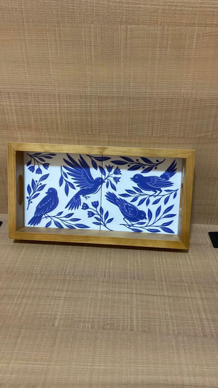 Traga charme e elegância para sua casa com esta bandeja decorativa em madeira, com fundo ilustrado em estilo artístico de pássaros azuis entre folhagens. Uma peça versátil que une praticidade e sofisticação, perfeita para servir ou decorar.