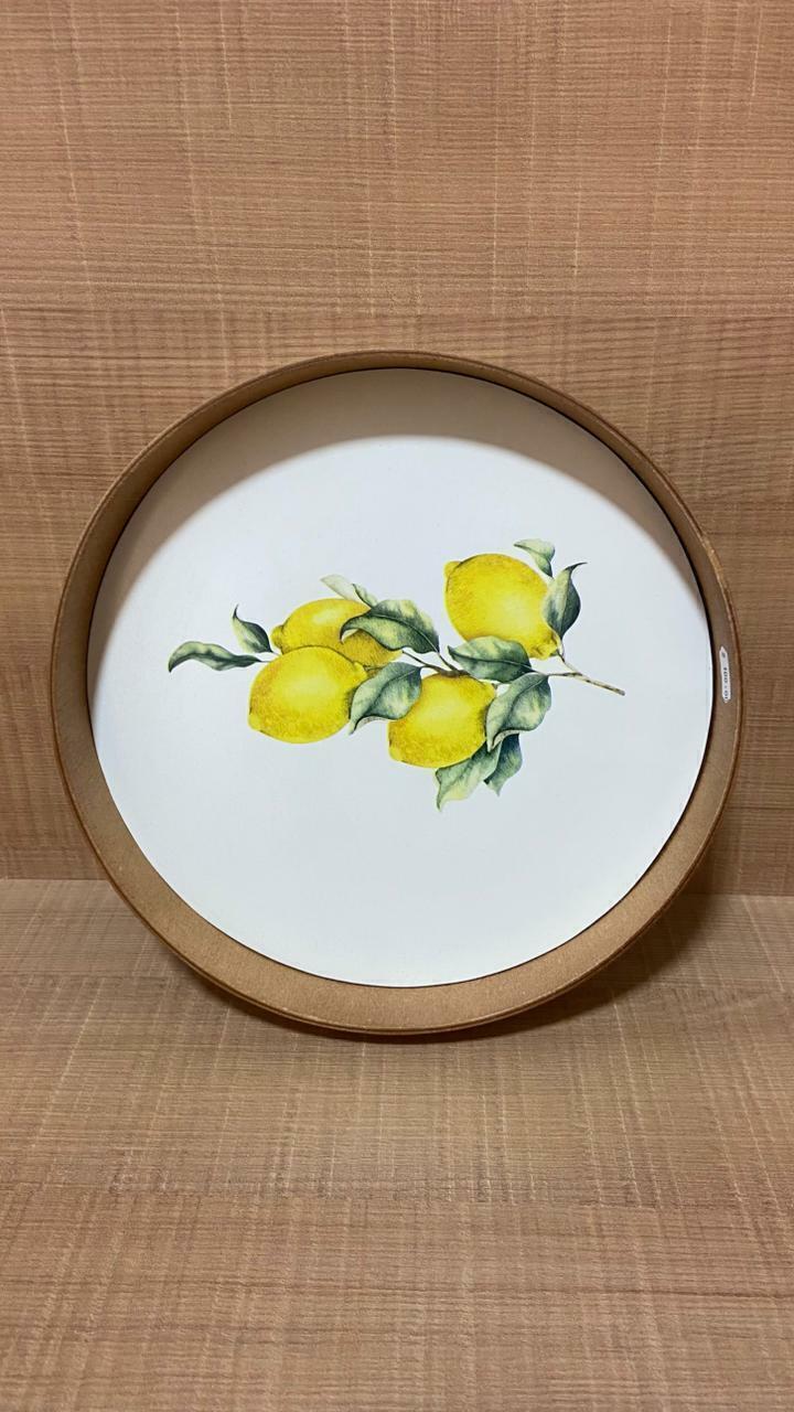 Deixe sua decoração ainda mais charmosa com esta bandeja em MDF com estampa de limão siciliano. Com 26 cm de diâmetro, é ideal para servir doces, frutas secas, panetones ou até compor a mesa posta como apoio para arranjos e velas.