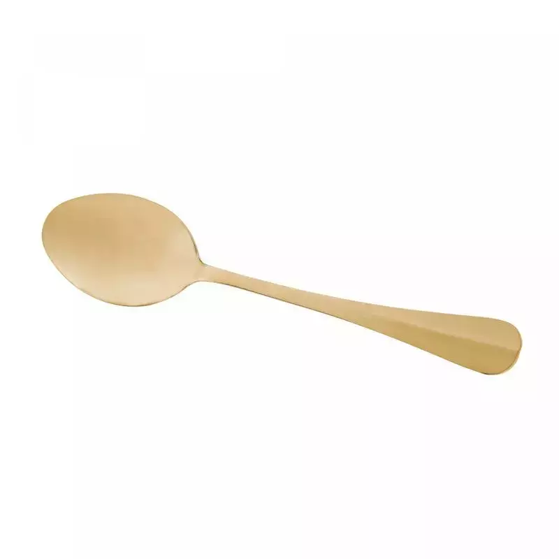 A colher é fabricada em aço inoxidável de alta qualidade, com um elegante acabamento dourado, proporcionando durabilidade, resistência e um toque de luxo à sua mesa.