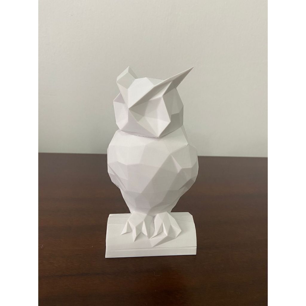 Símbolo de sabedoria e mistério, esta coruja em estilo geométrico é uma peça moderna e sofisticada para decoração. Impressa em 3D com material PLA na cor branca, possui acabamento minimalista que valoriza os traços facetados, tornando-a um destaque em qualquer ambiente.