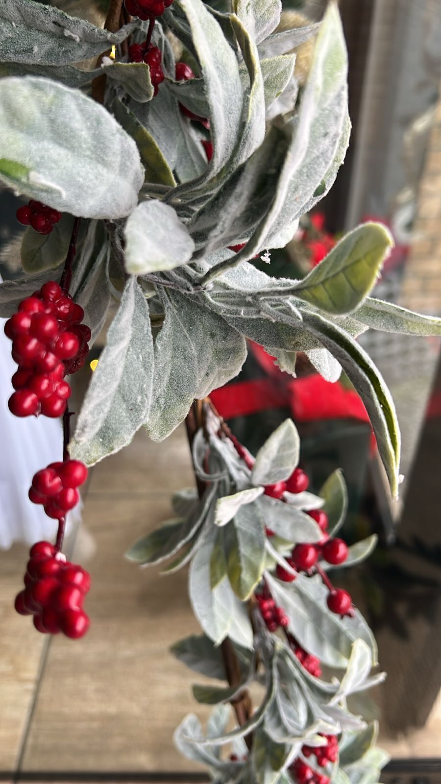 Encante sua decoração com este festão natalino de 1,50 metro, repleto de folhas verdes com efeito nevado e frutinhas vermelhas, que trazem o charme clássico do Natal com um toque rústico e elegante.