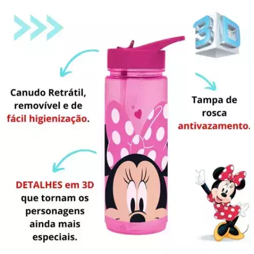 Leve, prática e cheia de charme! A garrafa infantil com estampa da Minnie é ideal para o dia a dia das crianças, seja na escola, no passeio ou em casa. Com tampa flip e canudo retrátil, ela é fácil de usar e evita vazamentos. Capacidade de 650 ml, perfeita para manter os pequenos hidratados com estilo.